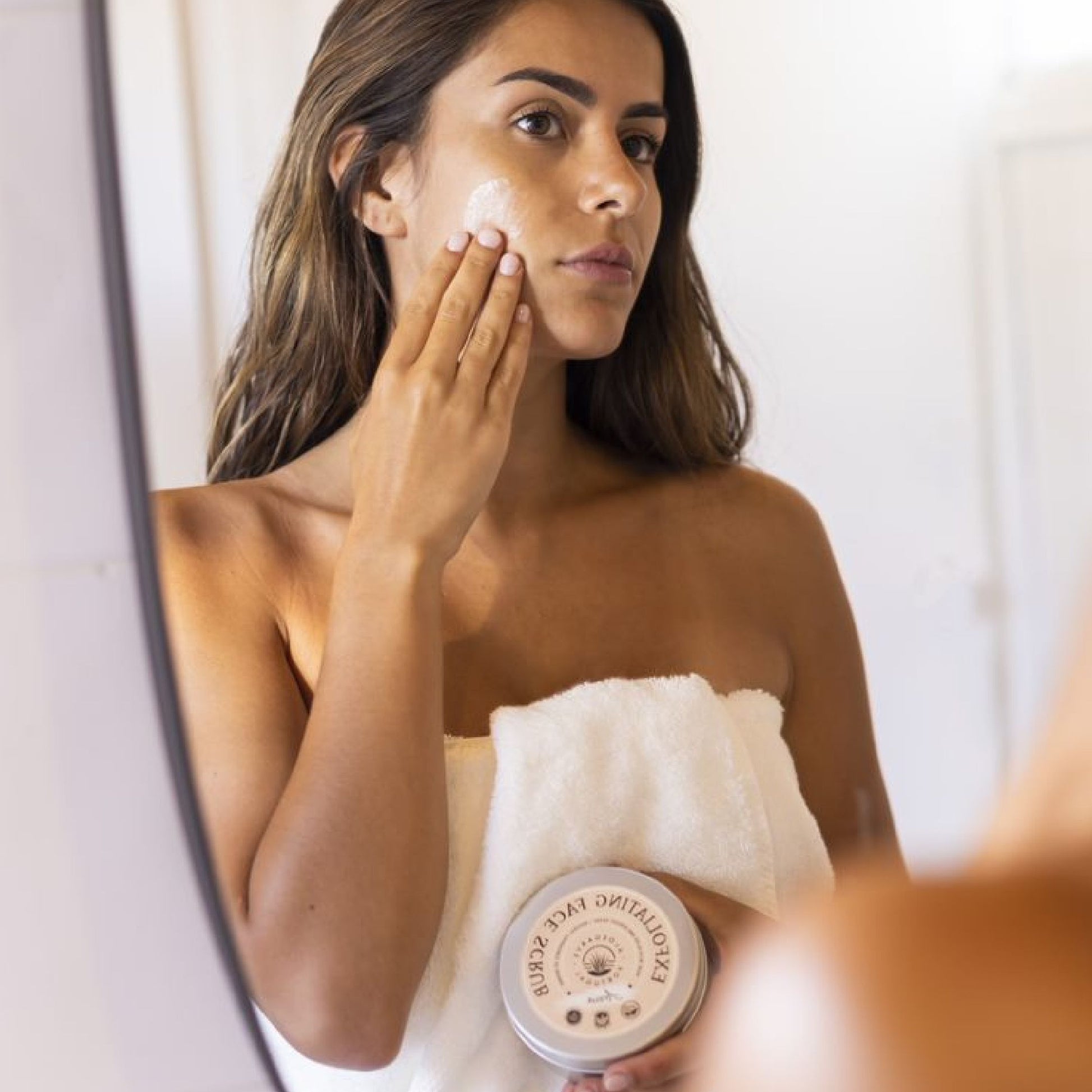 Unser Peeling nutzt die Kraft des Aloe Barbadensis-Blattwassers, das für seine beruhigenden und heilenden Eigenschaften bekannt ist, um gereizte Haut zu beruhigen und die Feuchtigkeitsversorgung zu steigern. Das Peeling enthält außerdem Aprikosen- und Olivenkernpulver, die als natürliche Peelings abgestorbene Hautzellen sanft entfernen und verstopfte Poren befreien, ohne Reizungen zu verursachen. Dieser Peeling-Prozess bringt eine frische Hautschicht zum Vorschein und sorgt für einen glatten und lebendigen Teint.